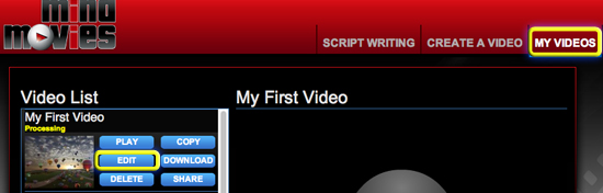 Click on the 'My Videos' tab in the top right navigation area. You will see a list of your videos appear in 'Video List' if you have previously saved a video. If your video is 'Processed', you can click on the title or thumbnail of that Mind Movie, ...