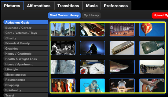 In Mind Movies Click 'Create A Video' Click the 'Pictures' tab Click 'More Options' Click 'Upload My own Pictures' Click 'Choose Files' You can choose one file at a time or choose multiple and import them all at once Locate and select the picture ...