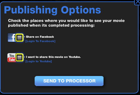 - Sharing your Mind Movie videos on Facebook or Youtube is optional. If you prefer not to share them, make sure the boxes are unchecked, and click 'Send To Processor'